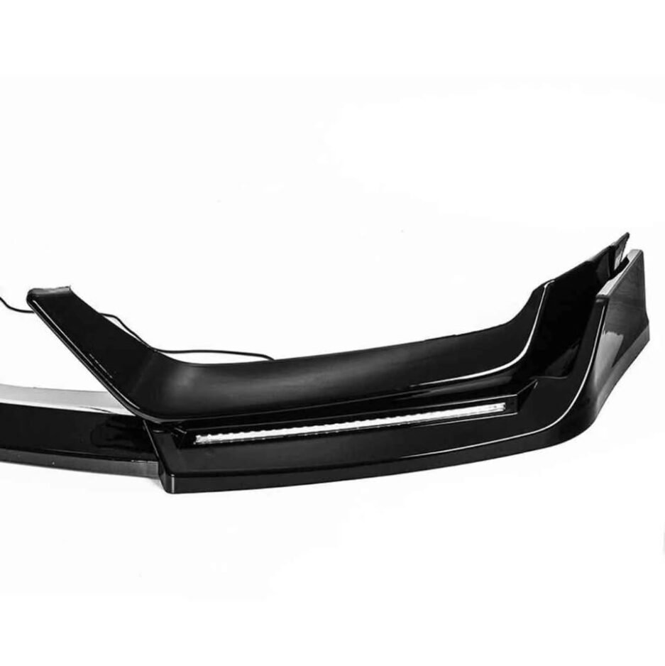 One of the standout features of this front bumper lip is its integrated sequential LED turn signal design. When activated, the LEDs illuminate in a smooth, flowing sequence, delivering a premium lighting effect commonly seen on high-end performance and luxury vehicles.